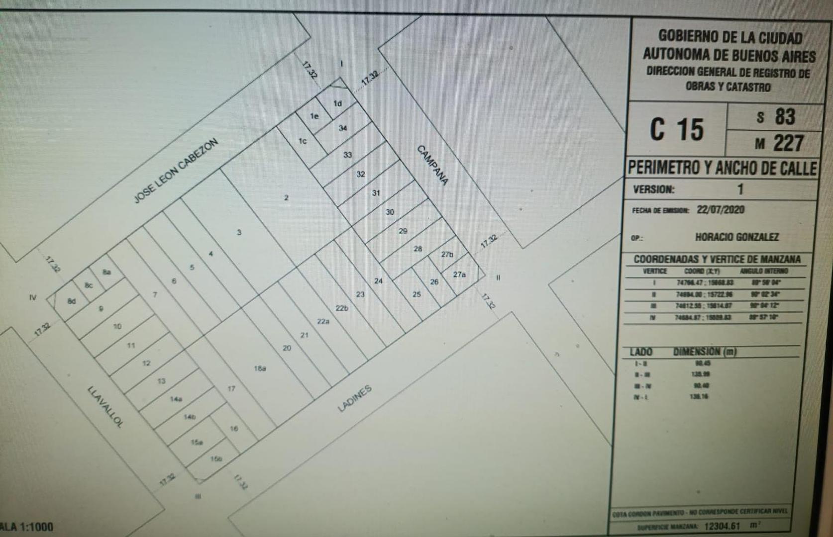 Terreno de 8.66 x 45 mts. ubicado sobre la calle Jose Leon Cabezon entre Lavallol y Campana en el barrio de Villa Pueyrredon.
